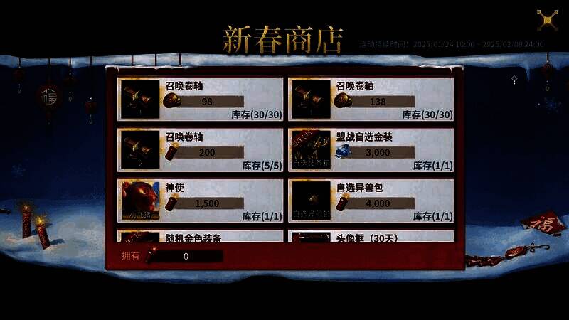 活动期间,领主大人可使用金币、钻石以及在「新春雪人」活动中获取的【爆竹】换取召唤卷轴、神使、自选异兽包、盟战自选金装、随机金色装备、限时头像框等道具。