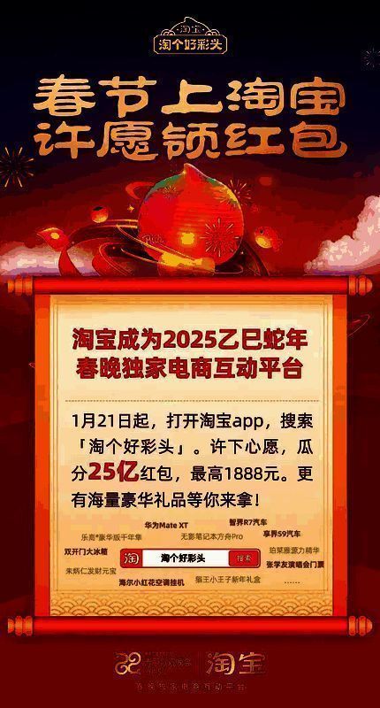 而作为今年蛇年春晚独家电商互动平台的淘宝,就推出了一个颇为有趣的互动玩法,即许愿领红包,瓜分25亿。