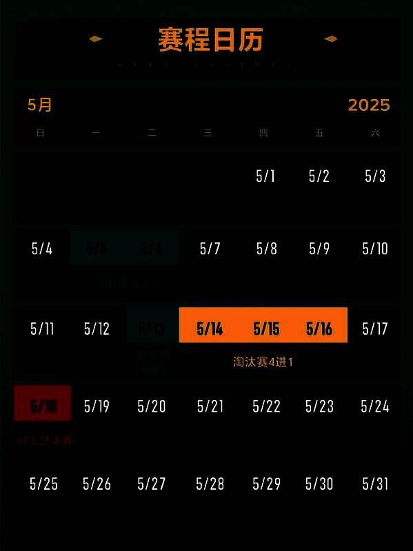 ACL王者荣耀赛事将分为预选赛、淘汰赛和总决赛三个阶段。根据2025年KPL春季赛常规赛第三轮结束后的排名,A组排名A5、A6的队伍以及B组的所有队伍将在5月5日至6日及13日展开资格赛的激烈角逐,争夺唯一一个晋级名额。紧接着,淘汰赛将于5月14日至16日进行,从资格赛中脱颖而出的队伍将与2025年KPL春季赛季后赛的第3至第5名展开对决,四支队伍中将有一支成功晋级决赛(季后赛名次并列的情况下,第三轮常规赛排名高者获得参赛资格)。最终,这支队伍将与2025年KPL春季赛的亚军在5月18日展开巅峰对决,争夺ACL的最高荣誉。
