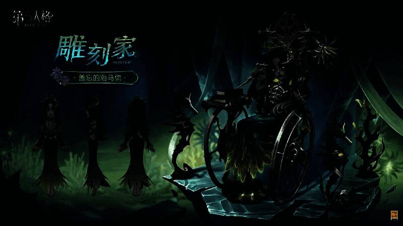 本赛季推理之径的奇珍时装为雕刻家-善忘的海马体,身穿绿色不规则花瓣形状的裙子,裙身似有海水折射的光斑,看起来有些神秘。她的头上戴着长长花枝形状的发饰,看起来像一个花冠,手持的刻刀状似海马,轮椅靠背上也有两只海马遥相呼应。