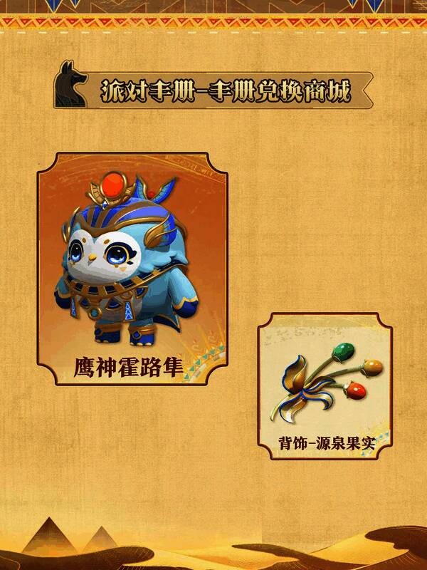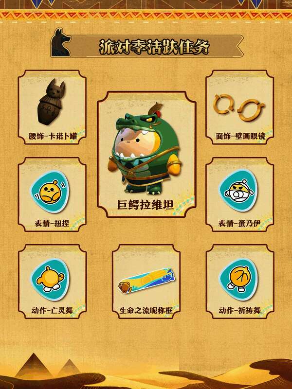 “金字塔传奇”派对季活跃活动正式开放!完成全新派对季活跃任务,即可前往兑换商店获取稀有盲盒“巨鳄拉维坦”、稀有配饰“卡诺卜罐”、“壁画眼镜”,更有赛季限定全新表情“扭捏”、“蛋乃伊”,动作“亡灵舞”、“祈祷舞”,和“生命之流昵称框”等奖励等待兑换。