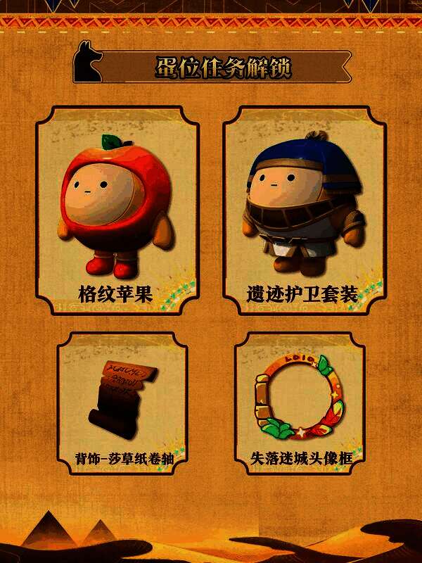 “金字塔传奇”派对季开启后,游戏将根据蛋位继承规则对玩家蛋位进行降级继承。与此同时,新派对季的开启也带来了新的蛋位任务,完成指定任务,即可领取外观“格纹苹果”、 遗迹护卫套装”,配饰“莎草纸卷轴”,及“失落迷城头像框”等丰厚奖励!