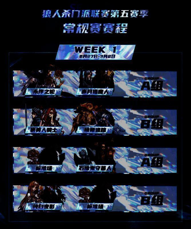 狼人杀门派联赛第五赛季·常规赛将在2月27日—4月6日期间进行,每周四至周日为比赛日,最终总决赛将在4月16日—4月20日进行,比赛将全程采用指定板子对战。