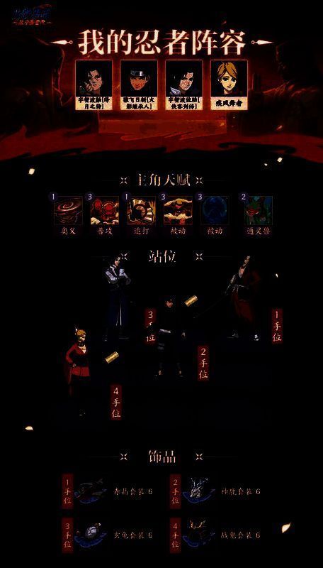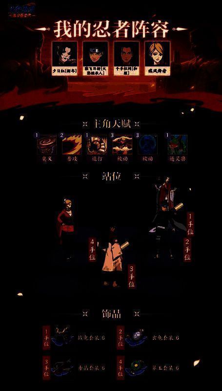 以上阵容推荐的天赋和站位,以及饰品搭配仅供参考,可根据自己的理解与实际情况进行调整。猿飞日斩[火影继承人]的搭配上基本是配合木叶标签忍者,以及各类属性增益技能,而猿魔系列技能则主要提升整体坦度。虽然奥义具备专注效果,但首选位置仍然在一二手位,主要是为了配合其他一些忍者的增益效果,以及优先放出猿魔能为小队带来增伤和吸血的效果,期待他能在未来给我们带来更多的阵容搭配!