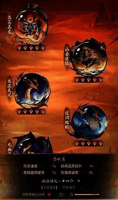 一共有八个血脉可以升级,累积消耗一定血石,还可以提升修士修炼速度、引魔香效率等挂机属性。最后每人至多能装配三个妖化进入战斗,在战场上变身不同大妖,发挥不同技能,整个策略十分多样化。