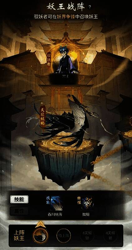 上面封印的妖王,会作为宗门战阵,宗主安排驭妖者和上阵妖王后,驭妖者便可在争锋战场中召唤出妖王,发挥对应技能,如鲲鹏的“吞川纳海”可提高积分获取等。