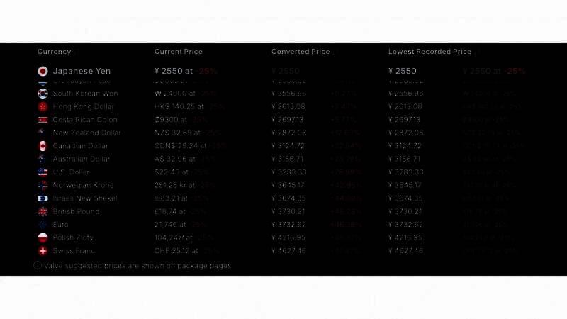面向全球开放的Steam支持约40种货币的销售。开发者虽然可以为自己的作品分别设定每种货币的价格,但这实际操作起来相当麻烦。为此,V社货币的基准推荐价格。开发者只需设定美元价格,其他货币的价格便会自动应用推荐价格。