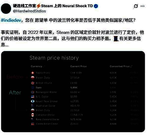 对于生活在低价区的用户来说,这某种意义上是个令人欣喜的定价,但在其他国家情况则不同。红迪上,一位用户关于波兰情况的报告引起了关注。当前推荐价格基准设定的2022年10月,正值疫情期间,波兰货币兹罗提对美元跌至历史最低点。虽然后来汇率回升至正常水平,但结果导致Steam游戏(推荐价格在波兰成了全球第二高。