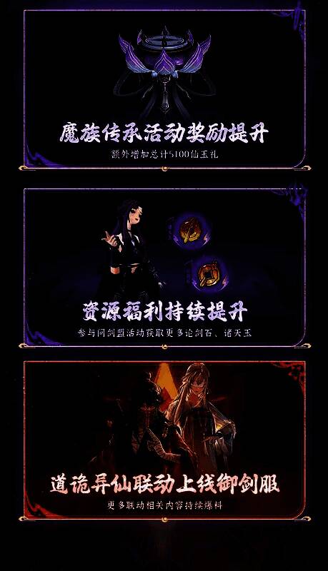 跨服奖励升级:位面汇聚服务器中,论剑台段位结算、跨服竞技胜败奖励全面上调,魔族传承活动新增额外仙玉保底。