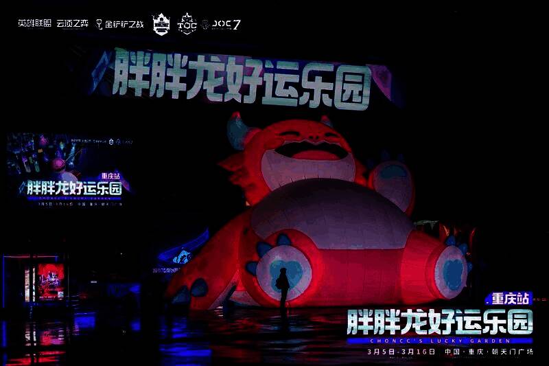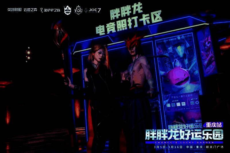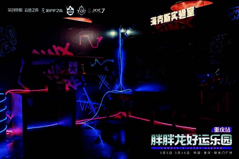 胖胖龙好运乐园将落地重庆朝天门广场,为弈士们带来好运加冕、海克斯实验室、DD街区:强能冲拳、胖胖龙电竞打卡区四大互动项目。整体主要以红蓝双色光营造双城氛围,现场陈设的细节中还蕴藏了许多与双城呼应的小巧思:例如DD街区:强能冲拳区域蔚的拳套,其细节和质感仿佛充满了海克斯能量。