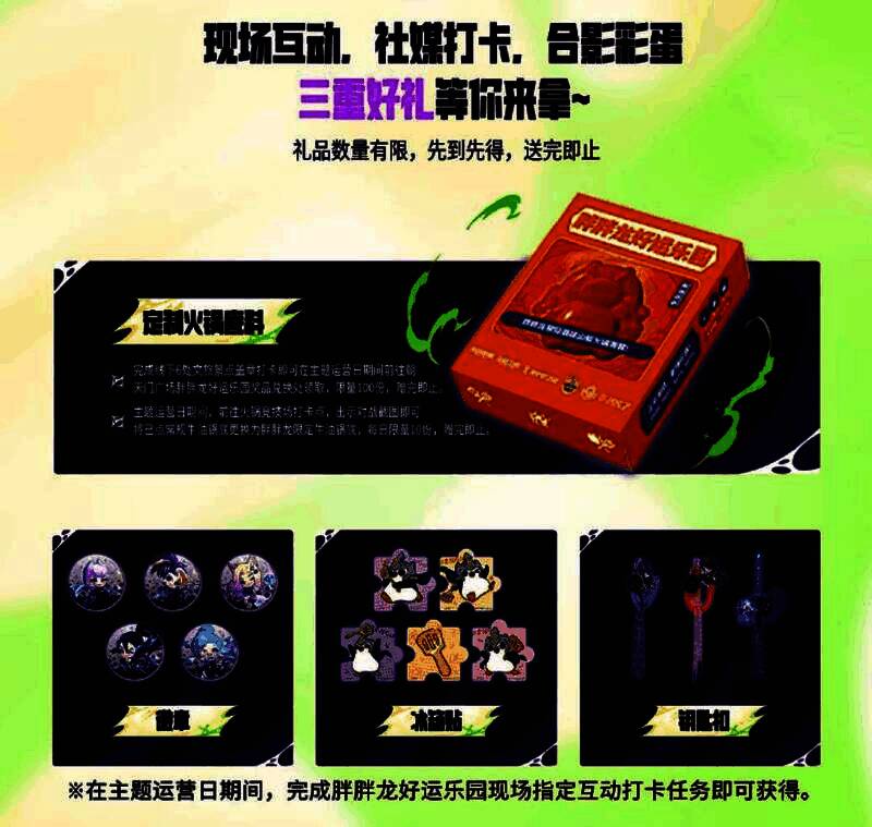 弈士们在现场领取打卡手册按照指引完成各项互动后,即可获得贴纸等惊喜礼品,与胖胖龙打卡参与抽奖还有机会带走手办、冰箱贴、小小英雄皮肤等奖励。另外弈士们如果在现场发布带话题的朋友圈或社媒帖子,还能在徽章、钥匙扣、冰箱贴三种奖励中择一领取。