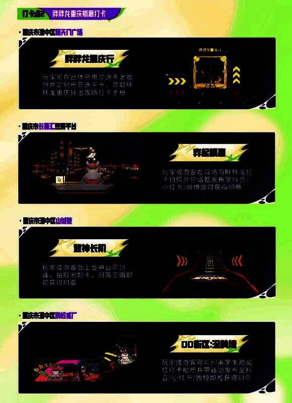 胖胖龙重庆躺赢打卡则将胖胖龙重庆行、弈起躺赢、登神长阶、DD街区:涂鸦墙四个打卡点分别设立在朝天门广场、长嘉汇观景平台、山城巷、鹅岭二厂,弈士们前往指定地点完成打卡任务可以获得印章,集齐一定数量印章便有机会获取定制火锅底料等特殊礼品。