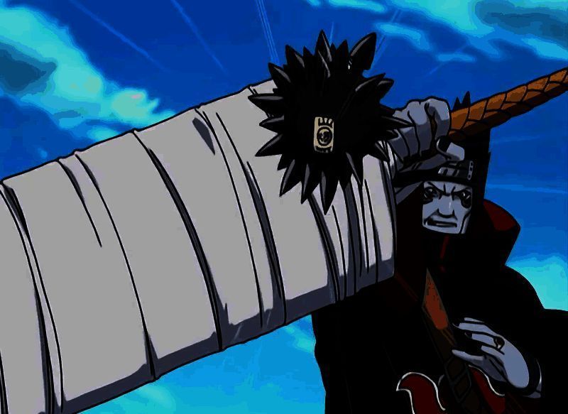 在忍界大战时期 ,在金角和银角被击败后,天天意外捡到他们遗落的三大忍具之一,能使用五种性质变化的“芭蕉扇”,天天用它来击败角都的地怨虞。