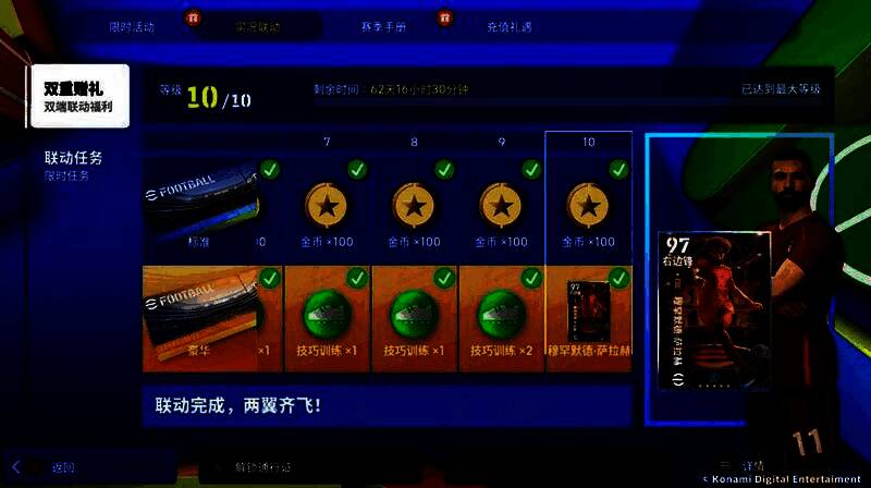 实况足球双端联动通行证活动持续进行中!完成通行证任务,获得经验值后可领取通行证等级奖励。免费版通行证,满级后可获得【金币】*1000;花费点卡解锁豪华版通行证,满级后可额外获得【技巧训练】*10和【梦幻增能精选萨拉赫】*1。