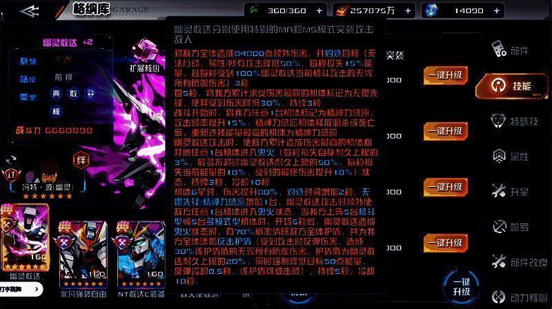 队长技【死亡先锋】,则能上场时就为我方所有机体增加能量,所有格斗型和多模式型机体攻击频率额外增加40%。而缘分技【宇宙海盗】,当满足特定的机体上阵条件时,幽灵敢达能够大幅提升自身及队友的能量回复速度,让整个队伍在战场上如虎添翼。如果使用机师技能,更能直接提升自身81%的属性!