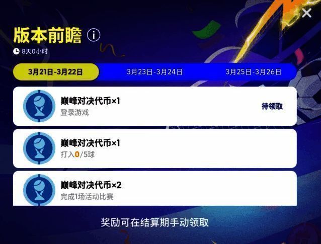 在【版本前瞻 限时赠礼】活动期间,玩家在规定时间内登录游戏并完成对应任务,最多可在结算期获得【巅峰对决代币*12】!