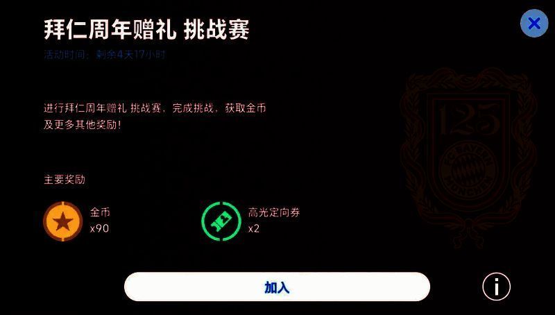 战胜【拜仁周年赠礼 挑战赛】中的对手,你将赢得【金币】和【高光定向券】作为奖励。完成更多阶段任务,可以获得更丰厚的奖励!你需要挑战多位强敌,才能成为最终的胜者!