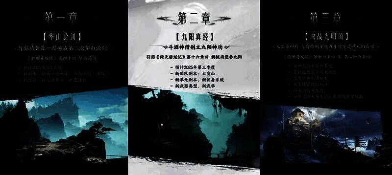 官方表示,会把金庸武侠的经典章回体结构融入游戏,以新地图、新副本和新故事呈现知名桥段,打造“金庸平行宇宙”。《射雕》将于2025年5月上线首章”华山论剑“,重现武林盛事;第三季度围绕《倚天屠龙记》打造 “九阳真经"”篇章,揭秘神功起源;第四季度将开启第三章 “决战光明顶”,共续江湖新篇。