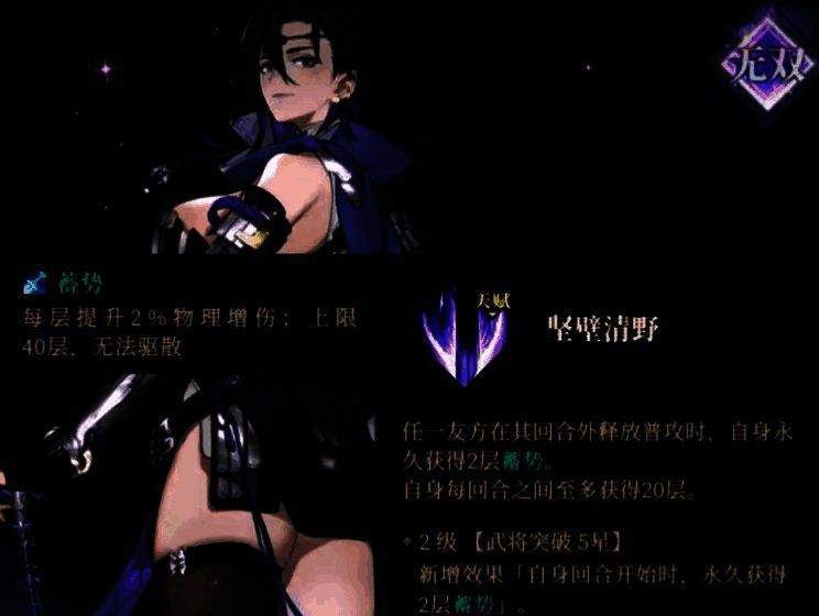 首先,王异的天赋“坚壁清野”可谓是她的核心亮点之一。每当她回合结束,或队友在回合外普攻时,都会为自己叠加一定层数的专属增益“蓄势”。这个蓄势能够显著提升她的物理增伤效果,使她在战场上的伤害输出更加爆发。简单来说,王异的每一个回合都充满了蓄势待发的潜力,这让她在面对敌人时,能够精准打击,展示出强大的威慑力。