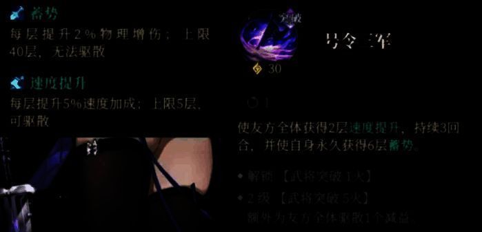 除此之外,王异的突破技“号令三军”也极具战略价值。使用后,她能够为全体队友驱散减益效果,并额外提升自身和队友的速度。而王异在使用该技能后,还会获得多层“蓄势”,进一步增强她的输出和生存能力。