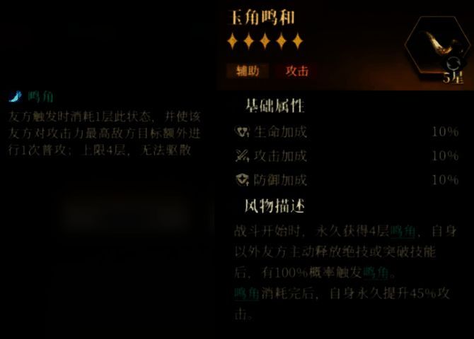 至于她的风物“玉角鸣和”,则是在队友释放绝技或突破技时提供额外增益。每次增益消耗时,王异还会进行一次额外的普攻,而这些增益消耗完后,将直接提升她的攻击能力。简单来说,王异的伤害输出与队友的协作息息相关,正是这份配合让她在战场上显得极具灵活性和威胁。