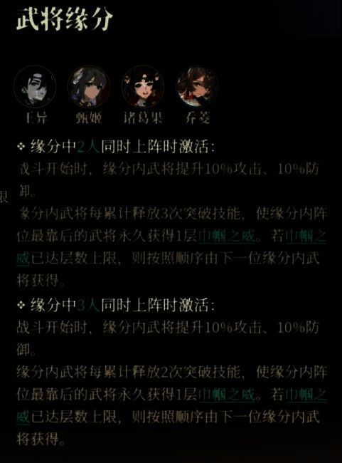 在缘分方面,王异与甄姬、诸葛果和乔菱有着特别的联系。通过提升缘分内武将的防御和攻击,她能帮助这些武将更好地在战斗中发挥作用,特别是在突破技的战意消耗上,还能进一步增强队伍的综合作战能力。