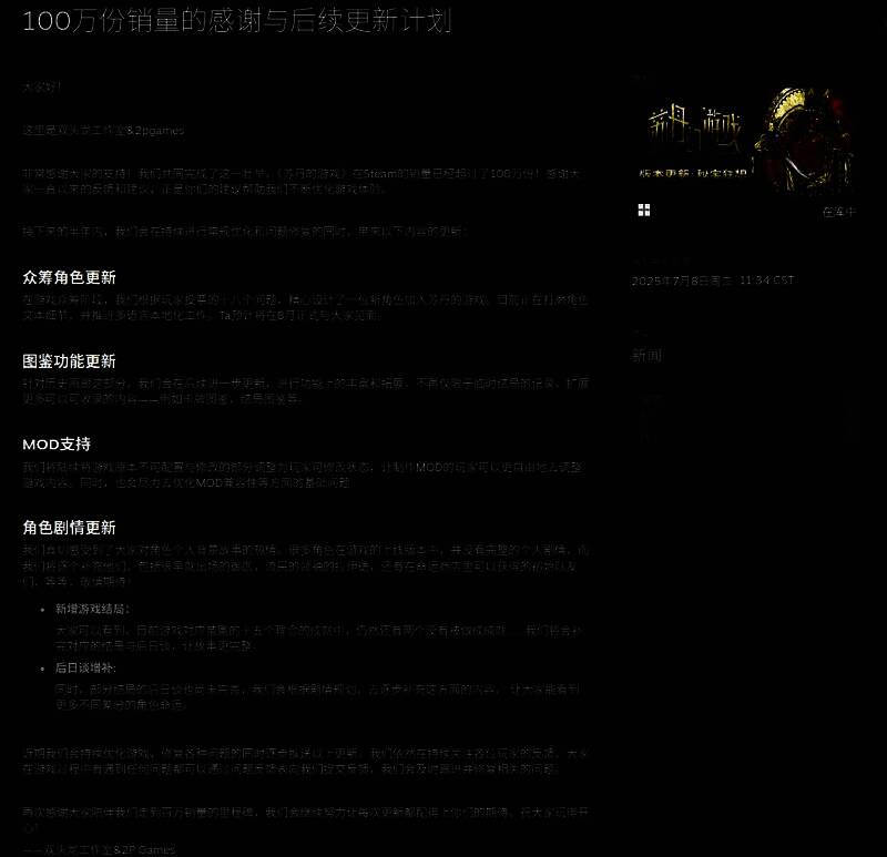 为庆祝销量突破100万,官方发布了特别贺图,并发布了后续游戏更新计划,承诺将在接下来的半年内逐步优化游戏体验,包括图鉴功能优化、优化创意工坊支持等。此外,还计划在游戏内推出更多角色的个人剧情、后日谈、新增游戏结局等丰富内容。