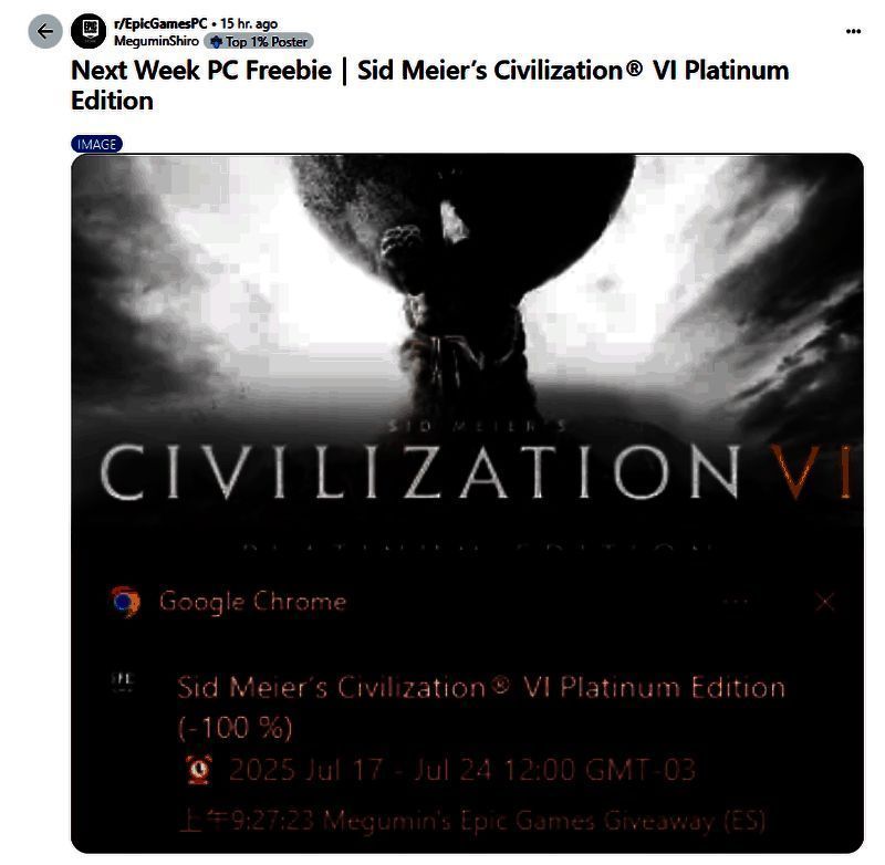 据Reddit知名爆料人MeguminShiro的帖子透露,Epic游戏商店下周一款免费游戏疑似泄露:Firaxis Games开发、2K发行的《文明6》白金版。领取时间为7月17日至7月24日。