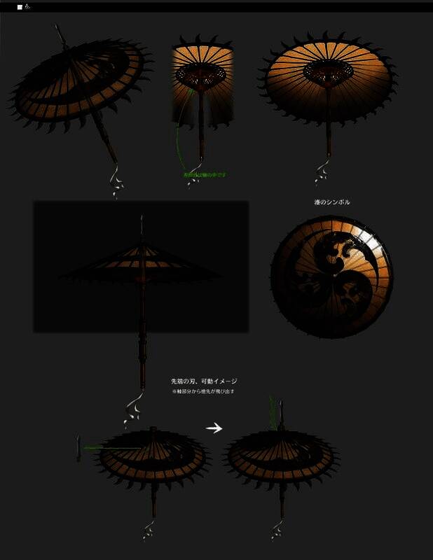 最初设想的是架起“铁伞”,步步为营缓慢接近野兽的笨重武器,但因为外观无趣且缺乏兴奋感,于是以“舞”为主题进行了重构。