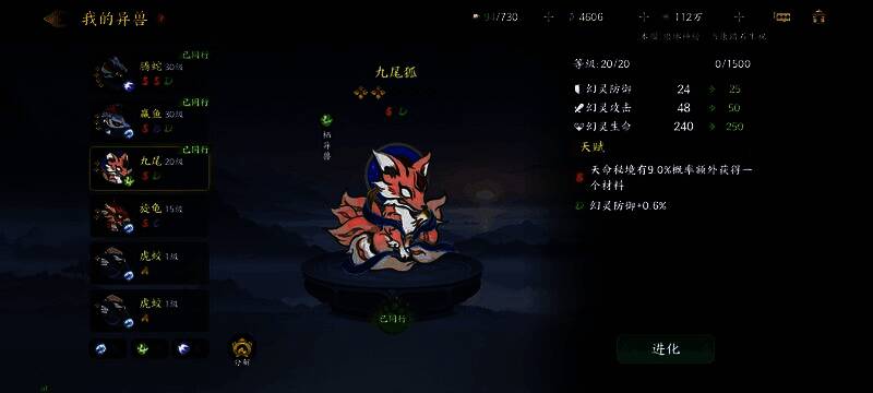 再举一个例子比如下方图里的二星S天赋九尾狐(本体)进化成三星,最多可以继承2个天赋,那么我们可以进化的时候,喂一只带有S天赋的狗粮异兽,这样我们就可以选择两个S天赋来继承,从而得到一个双S天赋的九尾狐(本体)。