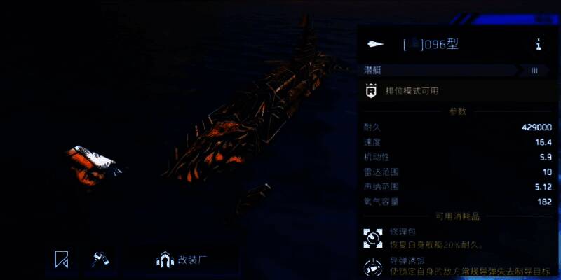 在它自身能装备4导弹3鱼类的强大火力配置下,只要096与对方舰船贴脸,便能轻松打出高额的爆发,是上限极高的潜艇,且操控手感很优秀。