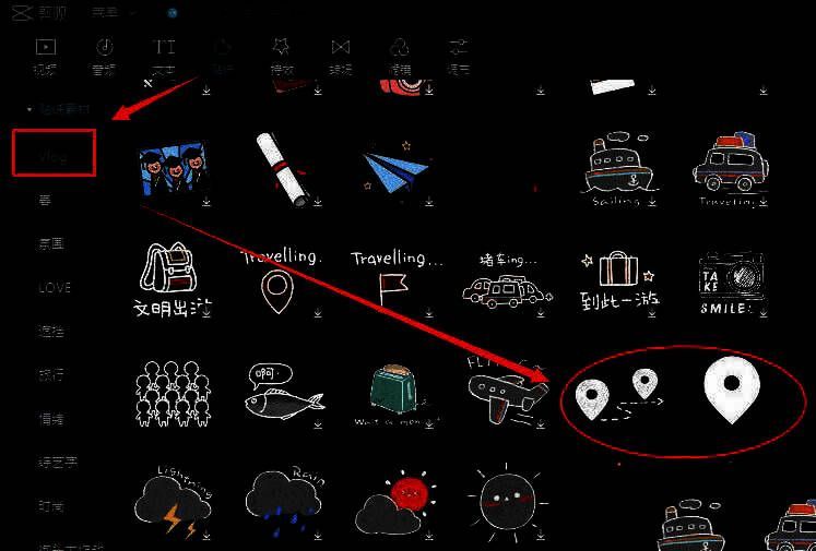 4.在贴纸素材的Vlog选项中找到并下载定位图标