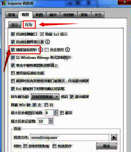 3.最后在行为选项中点击勾选捕捉鼠标指针按钮即可