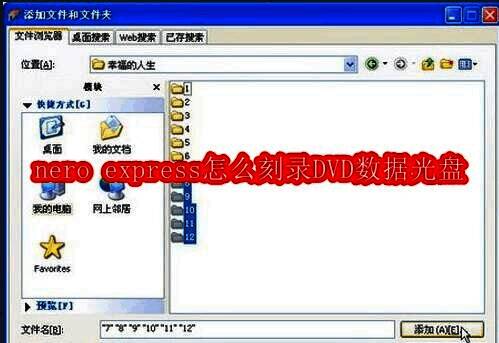 打开“添加文件和文件夹”窗口,找到并选中准备刻录到DVD光盘的文件或文件夹,并单击“添加”按钮。注意所添加的文件总量不能超过DVD光盘的总容量,完成添加后单击“关闭”按钮,如图,“添加文件和文件夹”窗口