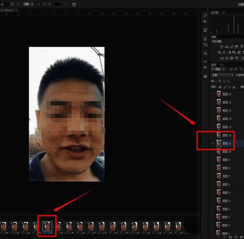 用鼠标分别单击“动画(帧)”栏和图层栏中的第11帧和图层11。将其选中。