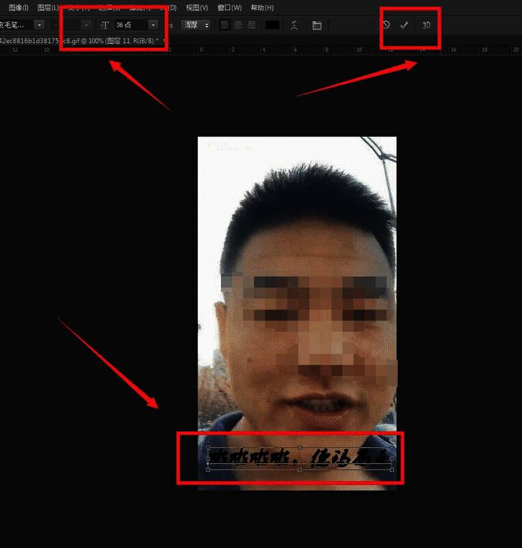 在GIF图片上,选择任意位置。输入文字并调整字体样式。选择√保存。