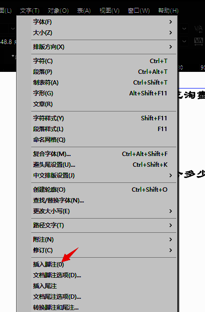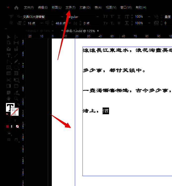 1.首先,打开InDesign界面后,选中需要插入注释的文本,点击上方的文字菜单