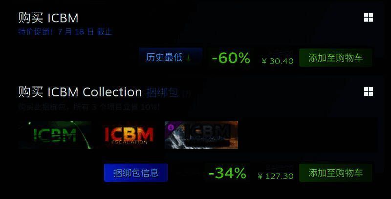 策略游戏《洲际弹道导弹(ICBM)》Steam新史低促销,原价76元,现价30.4元,此次促销截止7月18日。