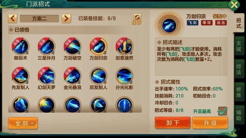 流派招式:御剑术、三星伴月、万剑归宗、万剑破空