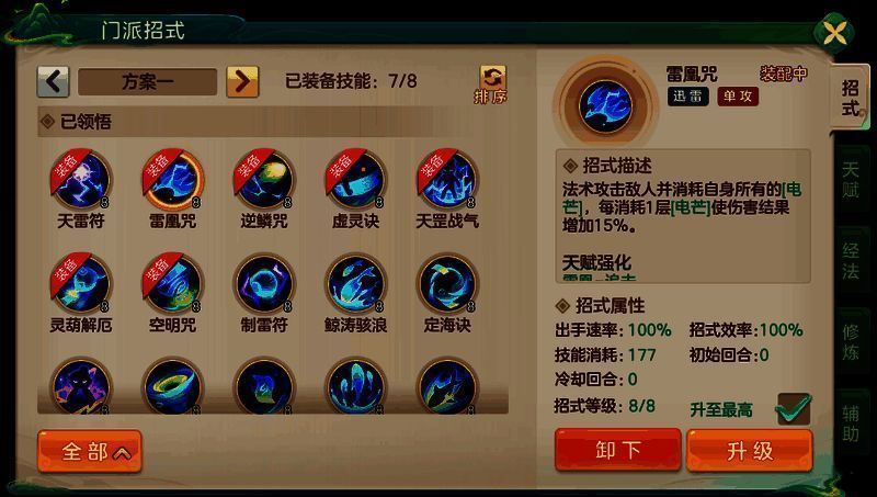 流派招式:天雷符、雷凰咒、天罡战气、风驰电掣