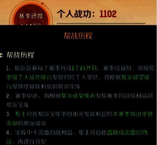 在整个赛季的图中,根据帮派威望排名发放相应的奖励,获得的奖励可直接到达宝库,不需要到其他地点去领取。所有帮主都可在帮派宝库当中自由分发战利品,直接发放到给本赛季具有较多贡献的帮派成员宝库当中。
