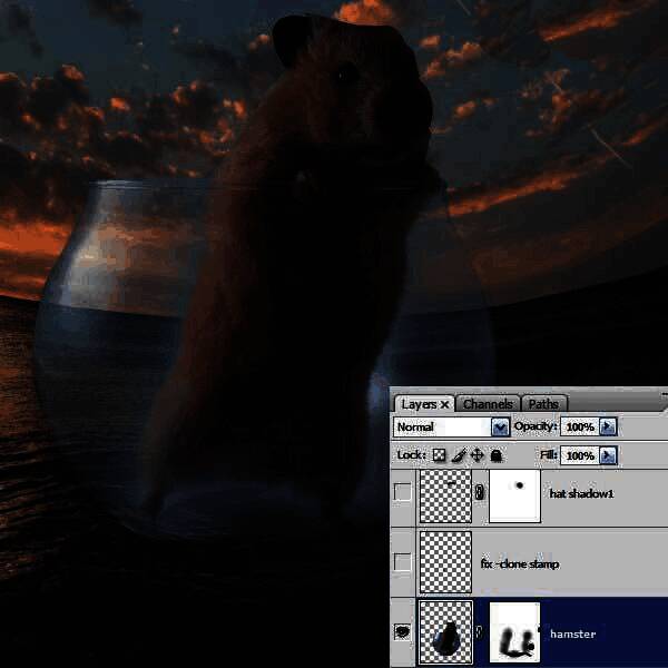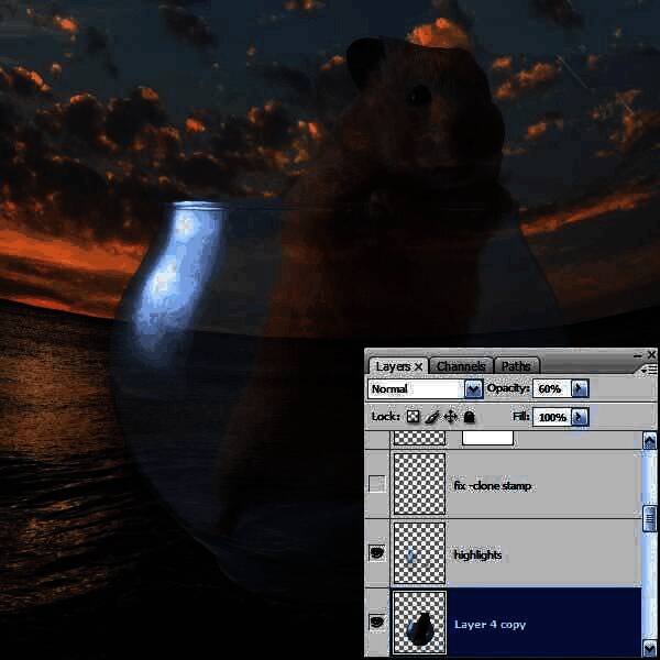 现在,我们必须将鼠标。你可以使用钢笔工具,并打断了他,但有一个更快的方法,其结果是一样好。把原来的玻璃层,在前面的亮点层和玻璃副本的层。与白口罩,并用黑色油漆,鼠标离开。确保你不要去附近的鼠标用软边刷。