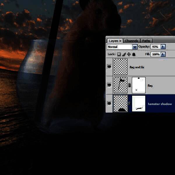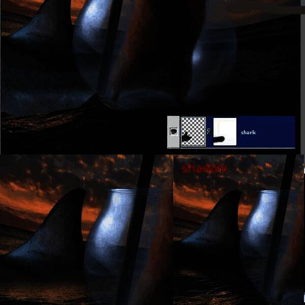 在这一步中,我们将添加鲨鱼,使这个形象更有趣。切出的鱼翅,并把它下的“仓鼠”层。覆盖在黑色另一层面具,画一个阴影。设置其不透明度为30%至40%。