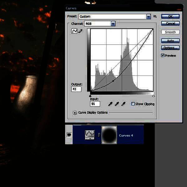 现在,让我们给一些过滤器和调整图层图像一副很酷的样子。第一次去调整图层>曲线(输入91输出41),然后删除中间的面具。