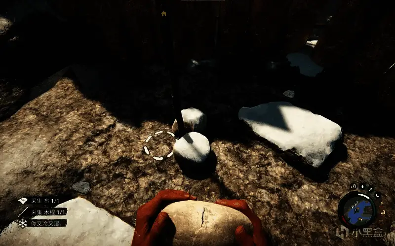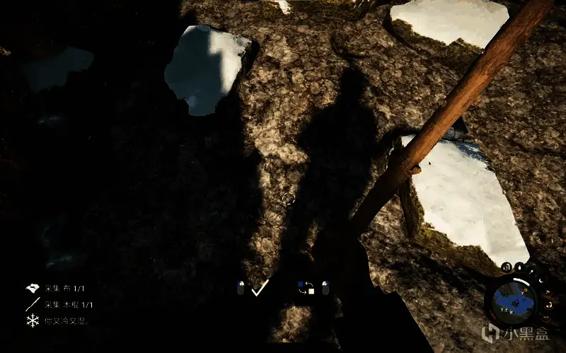 最后我们把木棍固定一下,从背包里找到岩石,拿在手上以后瞄准木棍的底部,然后就可以用三颗石头把木棍固定住了,非常结实,你站上去它都不会倒。