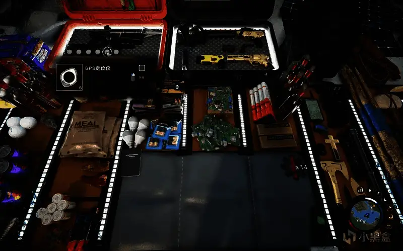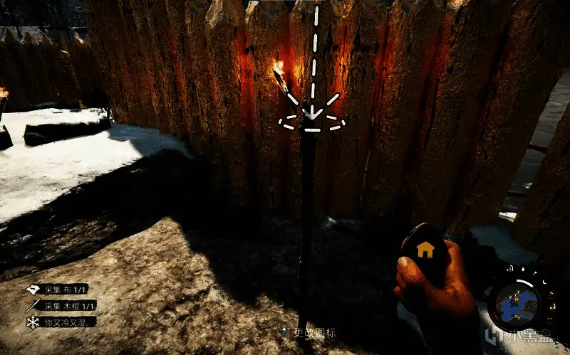 然后,从背包上边的盒子里拿出GPS定位仪,拿到手上以后我们可以按右键切换它的图标,选择好图标以后就可以对着木棍按鼠标左键放上去了。