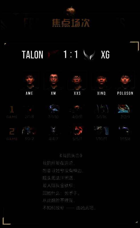 第二局:比赛陷入胶着,虽然XG前期取得优势,但在47分钟的拉锯战中失误频出,最终以14-34的人头比告负,双方1-1战平。