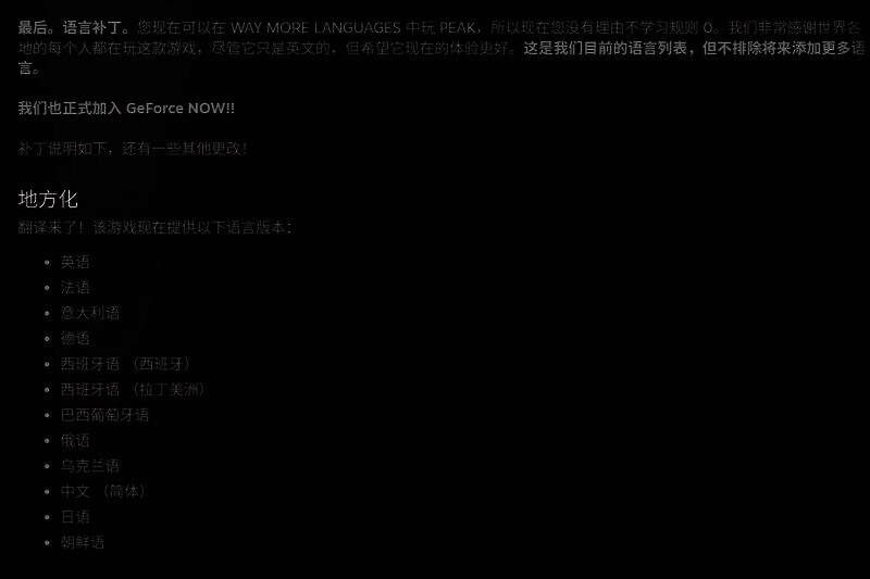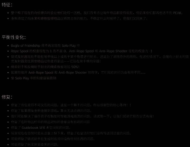 今天(7月11日)热门多人合作爬山游戏《PEAK》更新V1.7补丁,进行了平衡化调整、bug修复等一系列更新,其中最重要的一点是他们完成了本地化更新,更新包括12种语言,其中包括简体中文,同时官方也确定游戏的中文名称《顶峰》。