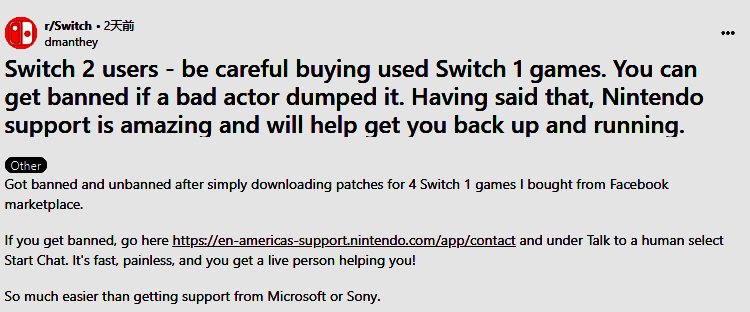 这名用户警告大家:“购买二手Switch游戏要小心,如果是被人恶意破解的游戏,你可能会被封禁。不过话说回来,任天堂客服非常棒,会帮助你恢复账号。”