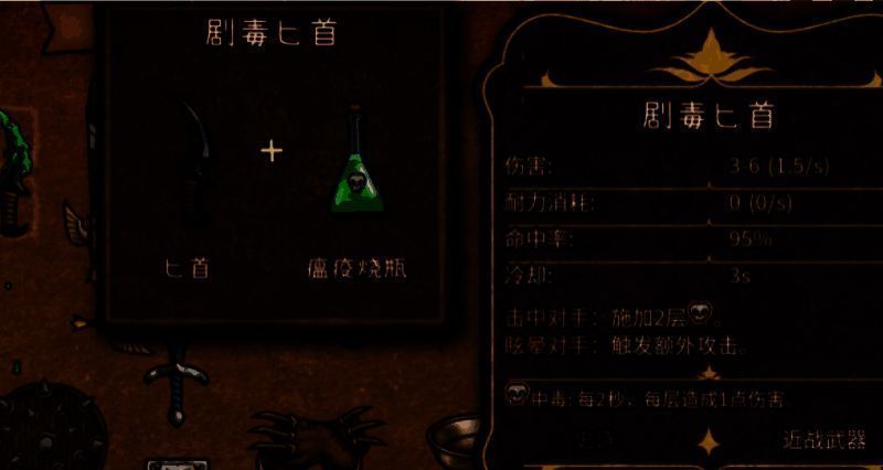 剧毒匕首的伤害在3点到5点之间、耐力消耗0、命中率95%、冷却时间3秒、命中对手以后能给敌人施加上2层的中毒buff,,中毒后,每2秒钟会给敌人造成1点的伤害。